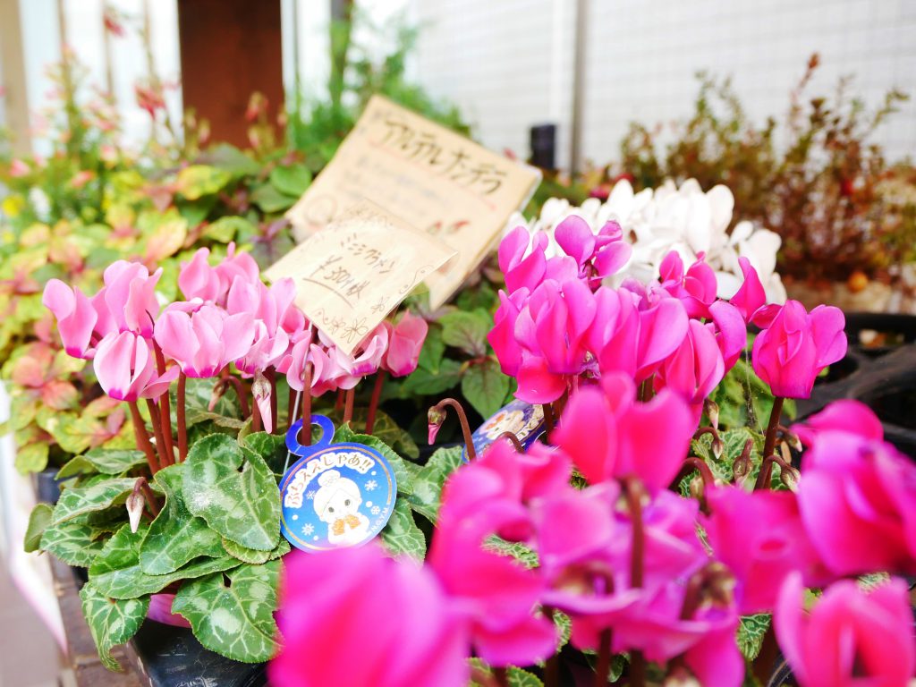 お店の前にも季節の植物が飾られています。この日は冬の庭を彩るシクラメン