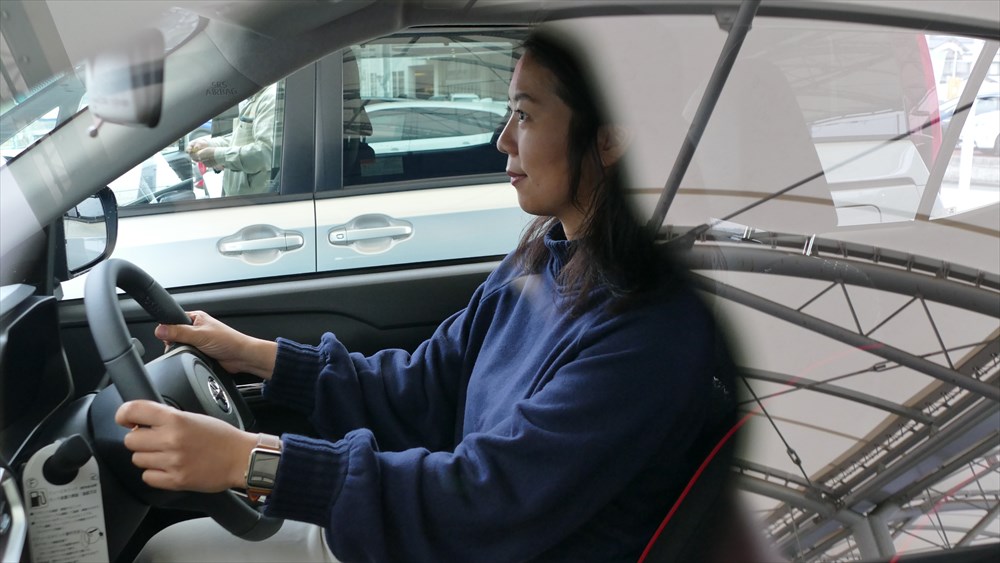 広々トランクに荷物を入れて、いざ運転席へ。緊張の面持ち…