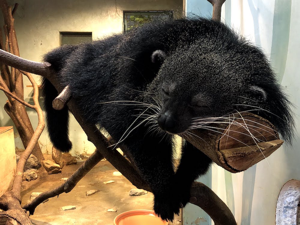 [su_note note_color=”#ffad2f” text_color=”#000000″]ビントロングは、爬虫類ではないのですが、アジアの熱帯雨林ゾーンができるまでの間、仮で爬虫館にいます。 アジアの熱帯雨林ゾーンは今年度完成予定です。[/su_note]