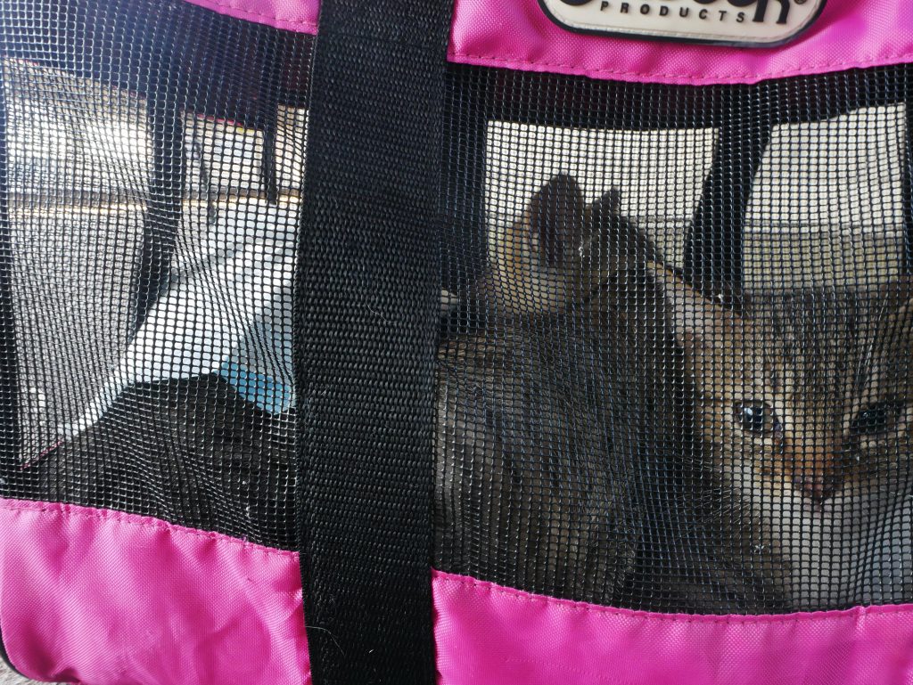 里親さんのキャリーバッグへ、顔が緊張してます。これから車で一路大阪へ。