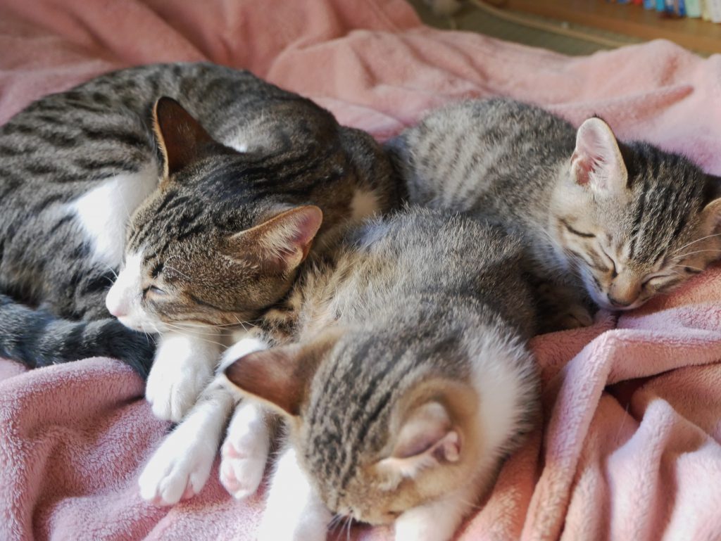 わが家で最後のお昼寝中のおちびにゃんず(右の2匹です)