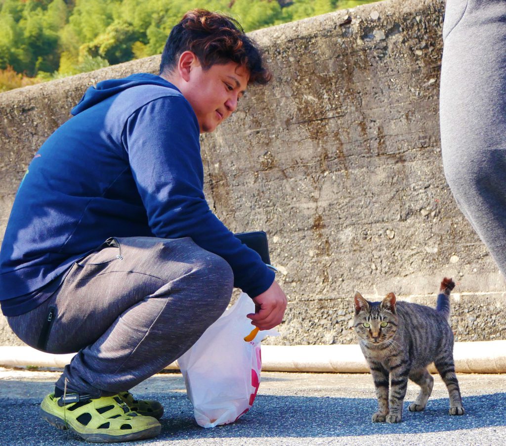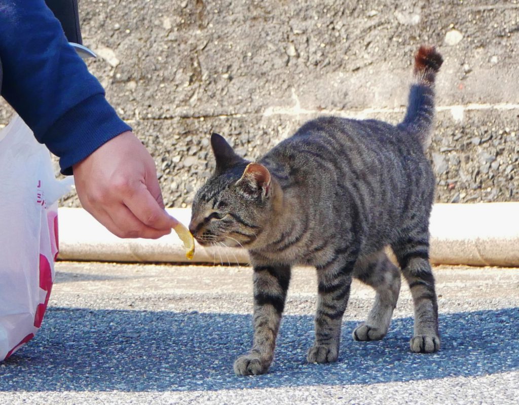 お?何かくれるのかな、と近寄ってきたにゃんこ。でも食べ物は持っていなくて、差し出されたのはみかんの皮!普通猫は柑橘系のにおいは好きではないのですが、くんくん嗅いでいるところはさすがみかん栽培のさかんな大津島の猫。でももちろん食べませんでしたけどね。