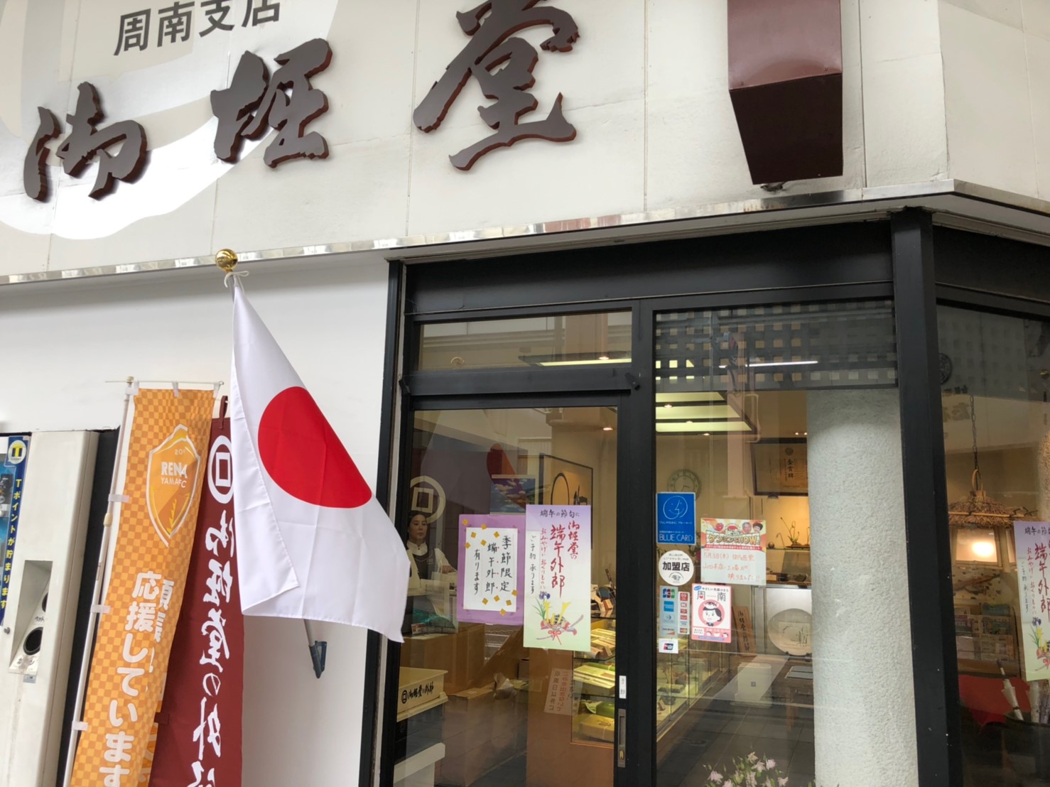 外郎でおなじみ御堀堂さん。「令和」の文字こそないものの、日本国旗が掲げられていました。