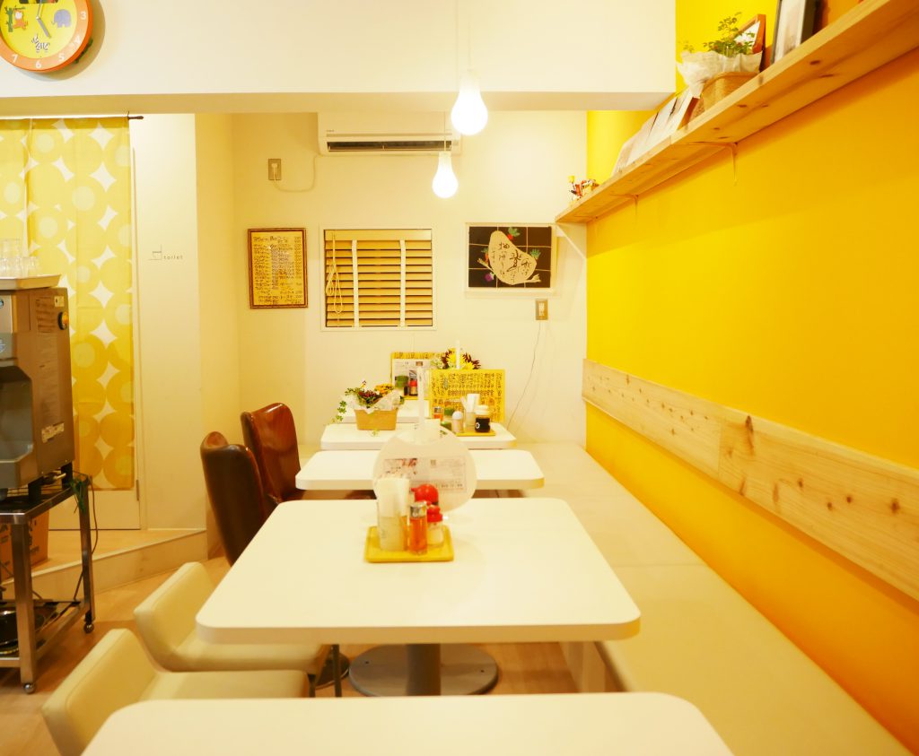 新しいお店は白と黄色の明るい店内。奥の椅子は前のお店から持ってきたもの。下の写真にも写ってます。