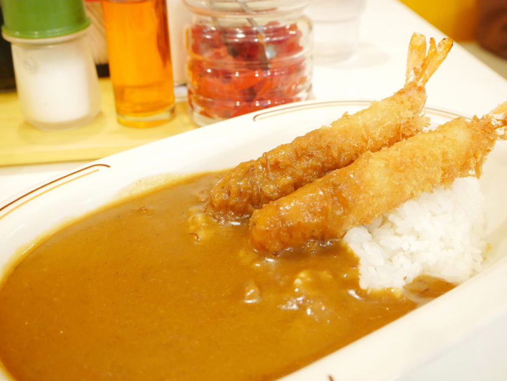 ライターがこよなく愛する「えびフライカレー」。揚立てえびフライが2本乗って600円なり