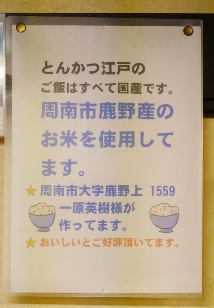 つやつやの白いご飯や、セットに添えらているお味噌汁やお漬物が美味しいのも、とんかつ江戸が長く愛される理由のひとつ。ご飯は地元周南の米どころ鹿野のお米が使われています。