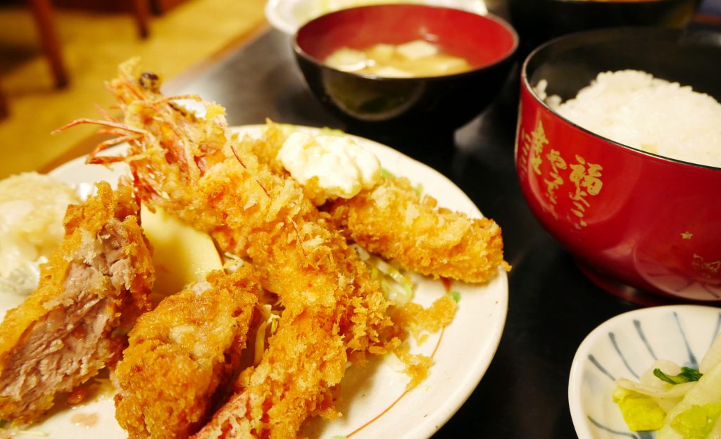 お腹ぺこぺこだったらおすすめなのかこのサービスセット!どーんと大きな有頭海老フライに、ヒレカツ、白身魚のフライ、自家製しゅうまいが一度に味わえます。
