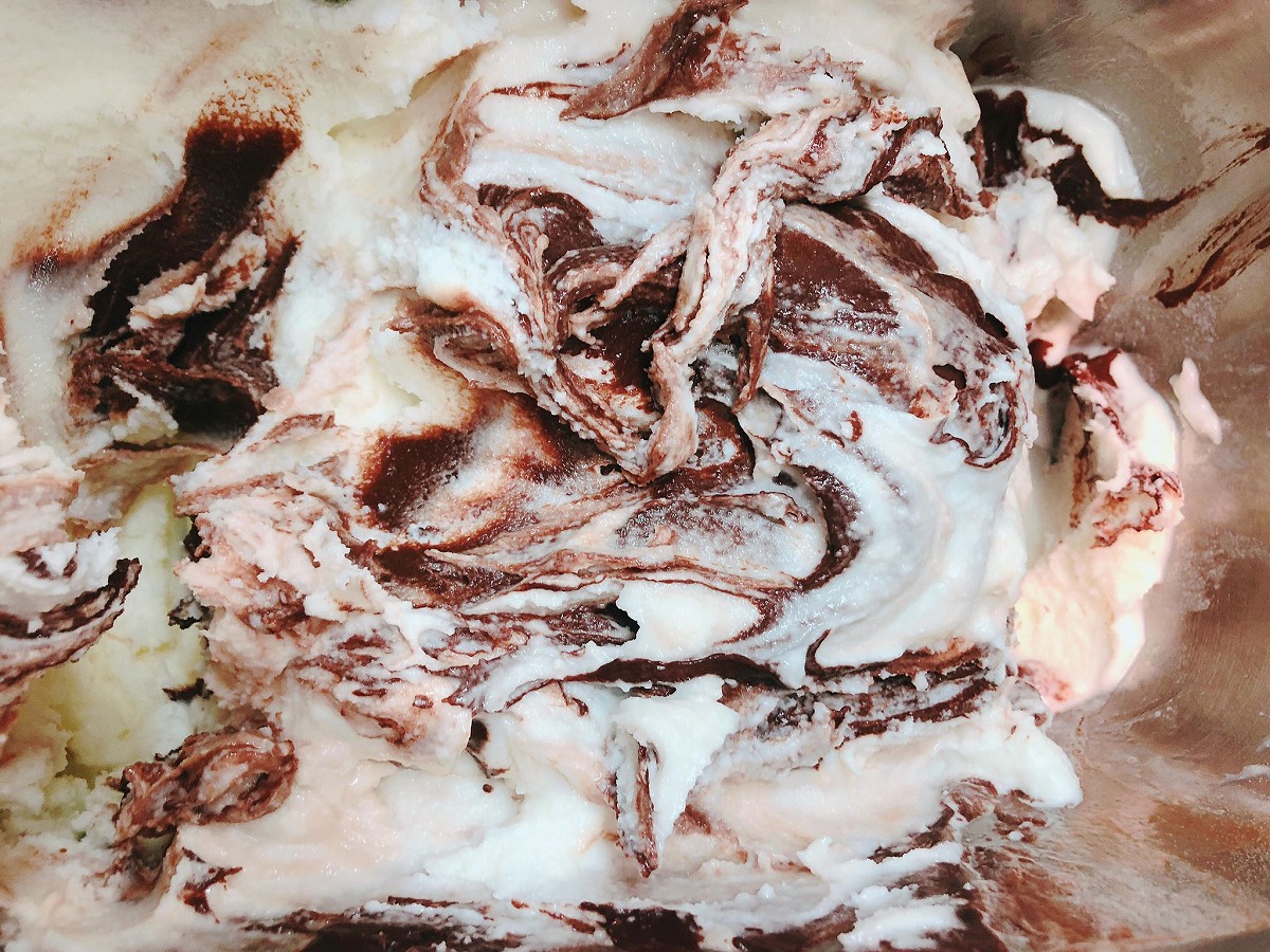 「牛乳を使わない濃厚なカカオジェラートとホワイトチョコを隠し味に入れたミルクジェラートのコラボレーション。ビターミルキーな味わいです。お客さんに「えっ?何この味!?」と驚きと感動を伝えられるように、日々試行錯誤を繰り返しています」
