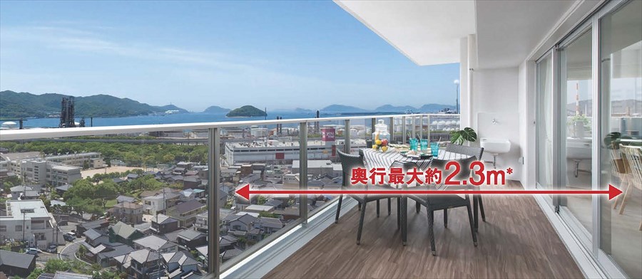 奥行最大約2.3mのバルコニーは、角部屋以外のお部屋も同様でかなり広く利用できます。