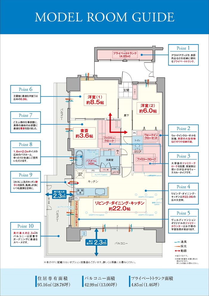 住居専有部分は、約95.16㎡と平屋にも負けない広さを誇りますが、モデルルームを歩くとそれ以上広く感じます。