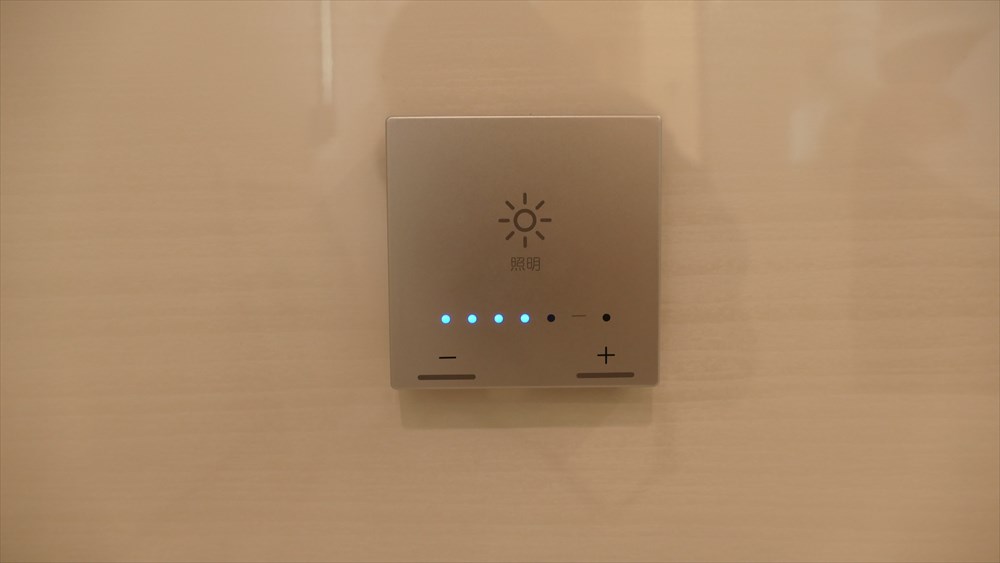 バスタブの横にちょこんとあるこのボタン。オプションで設置可能なバスルーム内の間接照明を段階調整するものなんです。