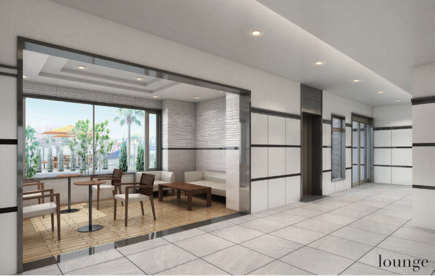 プレイロットの植栽を見ながら過ごせるラウンジスペースもあります。