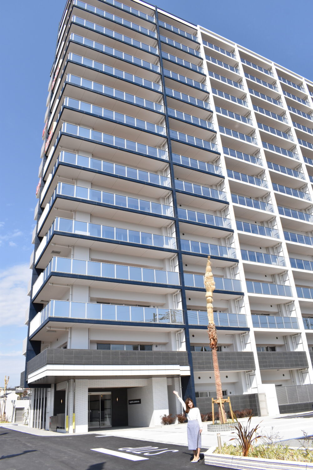 周南市最大級のマンションというだけあって、敷地面積約9,000㎡で総戸数116戸、地上15階建ての外観は白を基調としたスタイリッシュで高級感の溢れる印象です。