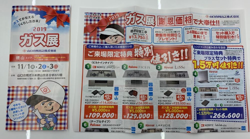 まずは11月1日(金)~11月3日(日)開催の山口合同ガス「2019ガス展」、ぜひご家族でお越しください(^^)/[/box]