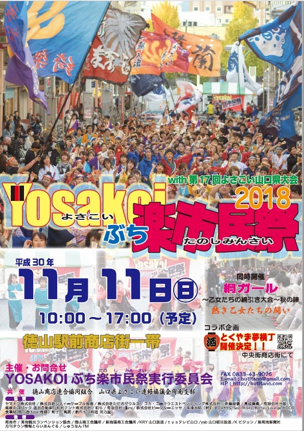2018/11/11、徳山駅前にYOSAKOIぶち楽市民祭(ぶちたのしみんさい)がやってくる!
