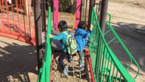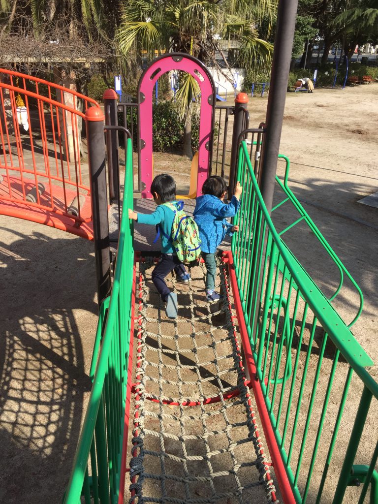 アッチからもコッチからもいろんな方法で登れますし、フィニッシュのすべり台は3つもあります。
